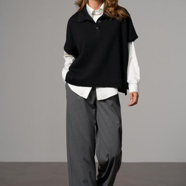 Wool Knit Vest With Side Slits Collared Poncho